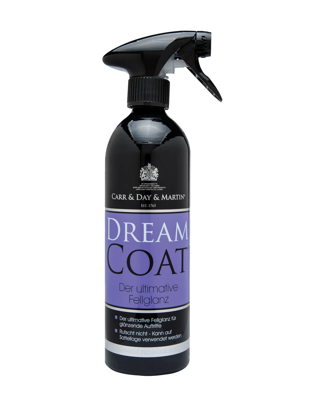 Das Carr & Day & Martin Dreamcoat ĂŒbertrifft mit dem ultimativen Hochglanz-Finish. Die einzigartige rutschfeste Formel unterstreicht die Muskeldefinition und kann auf der Sattellage sowie MĂ€hne und Schweif verwendet werden, ohne Fett oder RĂŒckstĂ€nde zu hinterlassen. FĂŒr ein Hochglanz-Finish Dreamcoat vor dem Flechten auf MĂ€hnen und Schweif sprĂŒhen.