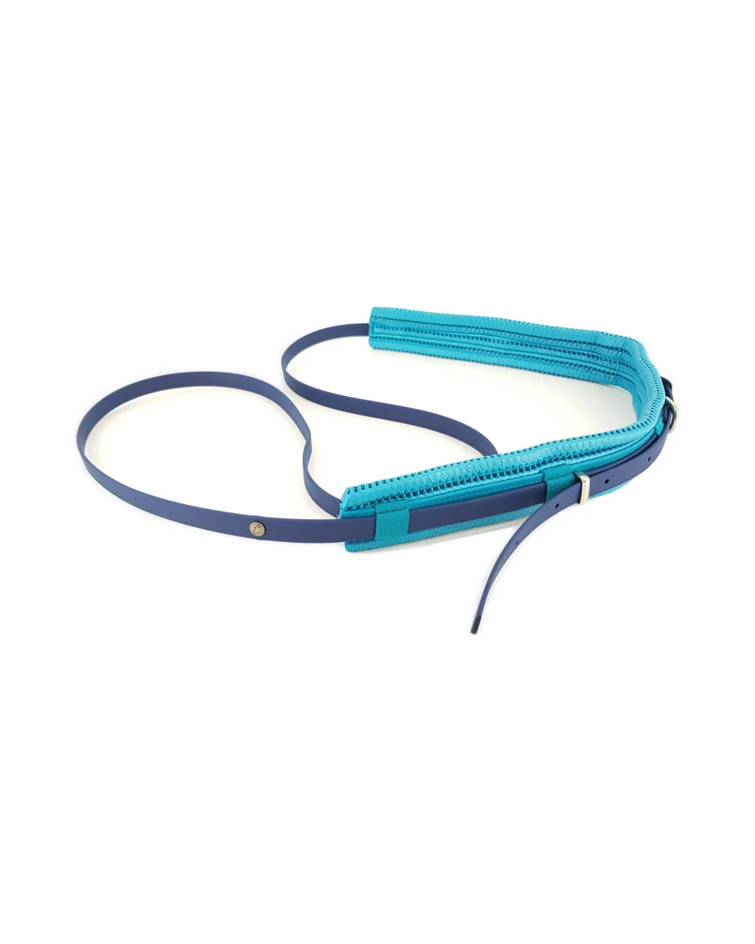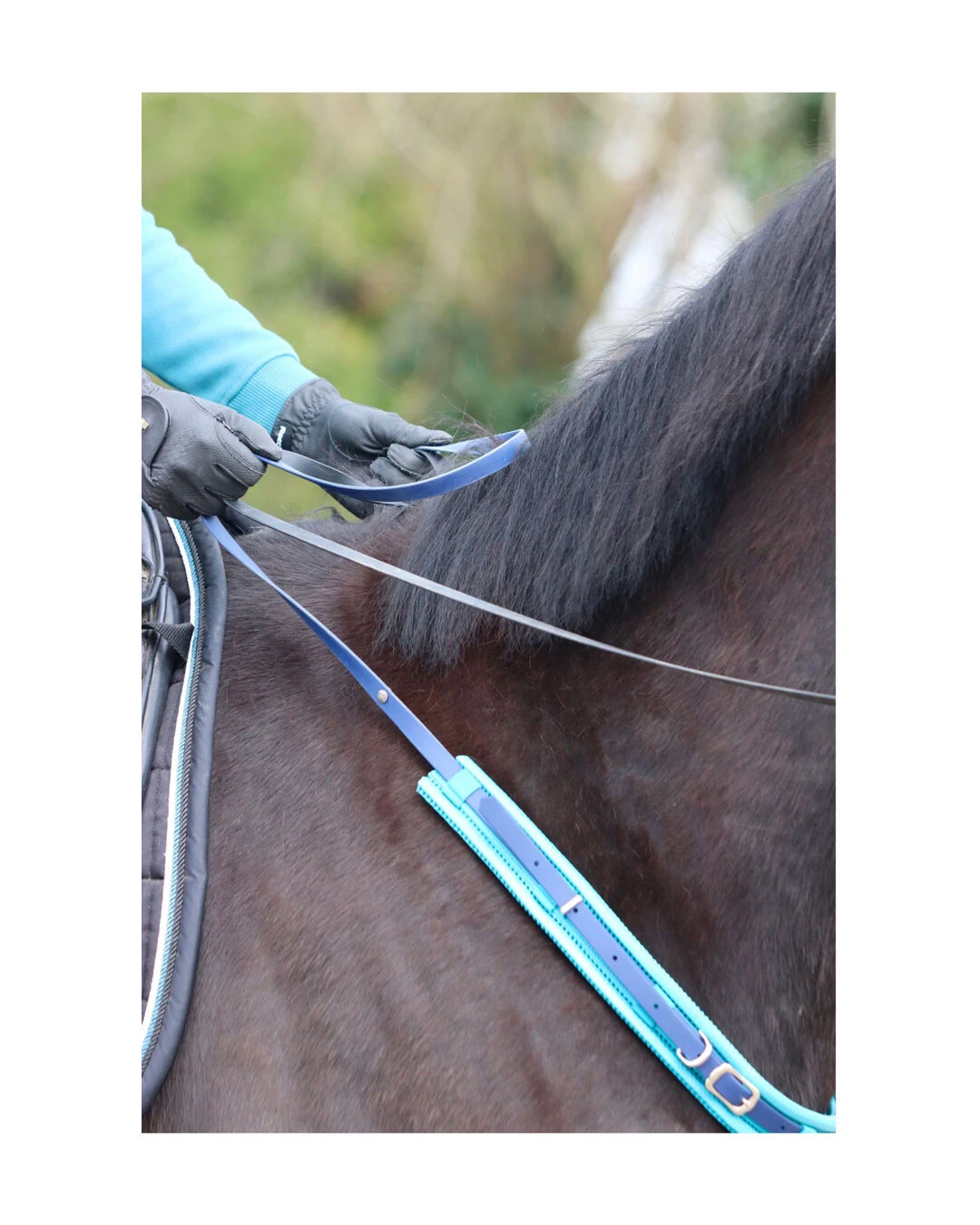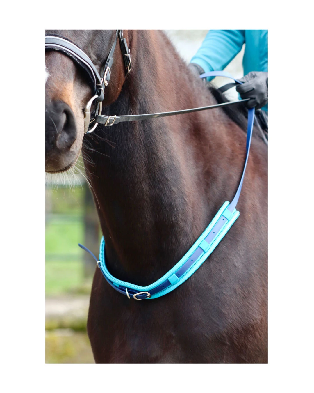 Der Equimero Equizügel ist ein mittels Schnalle größenverstellbaren Halsring aus Biothane mit einer verschiebbaren Polsterung. Die Schnalle zur Größenregulierung liegt im Polster eingebettet und sitzt somit unter dem Pferdehals, so dass sie den Reiter beim Umgreifen des Zügels nicht stört. Ein zusätzlicher D-Ring für die feine Bodenarbeit bzw. Horsemanship befindet sich ebenfalls an der Unterseite des Equizügels und lässt sich toll kombinieren mit der 7m langen Federleicht-Leine, die gerade einmal 220g wiegt. Dank des Equizügels haben die Reiterhände keinen zu großen Aktionsradius mehr, was dazu führt, dass der Reiter bewusster Körperspannung im Rücken erzeugt und so seine Sitzposition erheblich verbessert. Das Zusammenspiel von Sitz und Einwirkung wird hier durch den Selbstlerneffekt gefördert. Und auch für das Pferd ist der Equizügel vorteilhaft: Durch einen Impuls über die im Brustbereich befindlichen Muskeln reagiert das Pferd, indem es sich im vorderen Bereich (Widerrist) anhebt. Damit werden Pferde unterstützt, die schwer in Aufrichtung zu bringen sind, Pferde die zum Stolpern neigen, aber auch Pferde, die sich aufgrund mangelnder Balance gern auf den Zügel legen oder zum losrennen neigen.Der Equizügel dient insgesamt dazu, die Balance und Koordination des Pferdes zu unterstützen. Die Wirkung des Equizügels kann man sehr gut am ungesattelten Pferd sehen und auch da schon mal üben. Mit leichtem Annehmen und sanftem Nachgeben kann das Pferd leicht lernen, sein Gewicht vor zu verlagern, den Hals noch einfacher abzuspannen und den Rücken loszulassen.