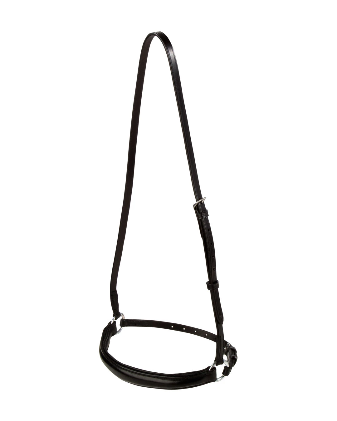 Klassisches Hannoversches Reithalfter von Kieffer mit abgepolstertem Nasenriemen und chromfarbigen Schnallen.