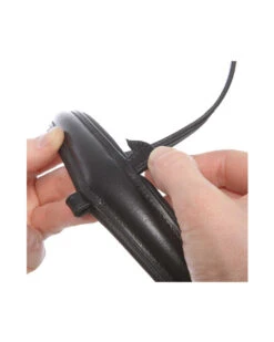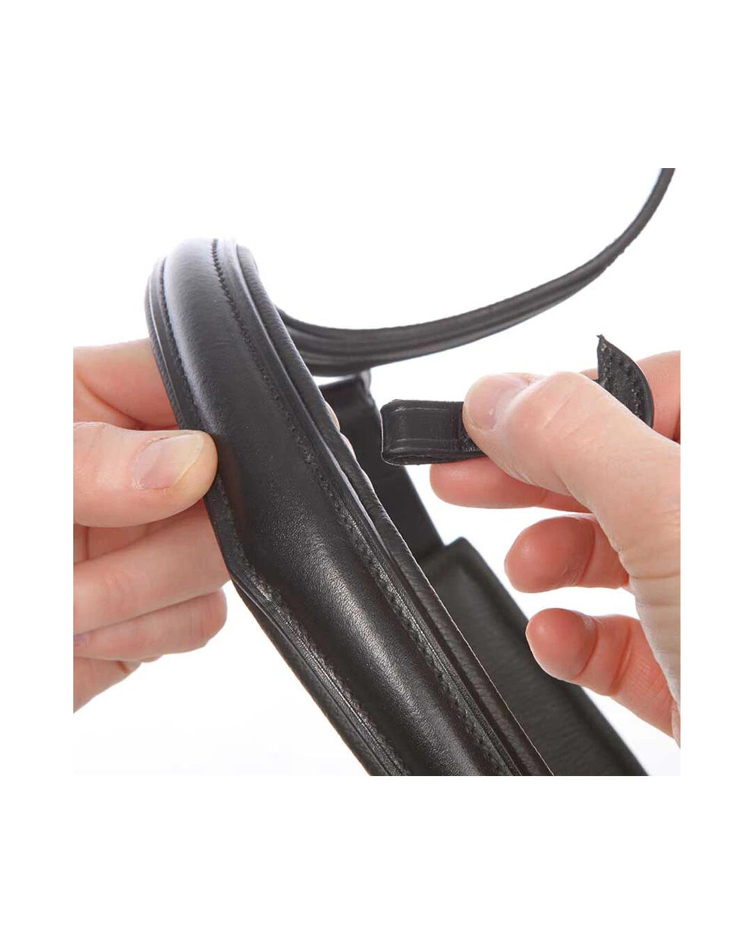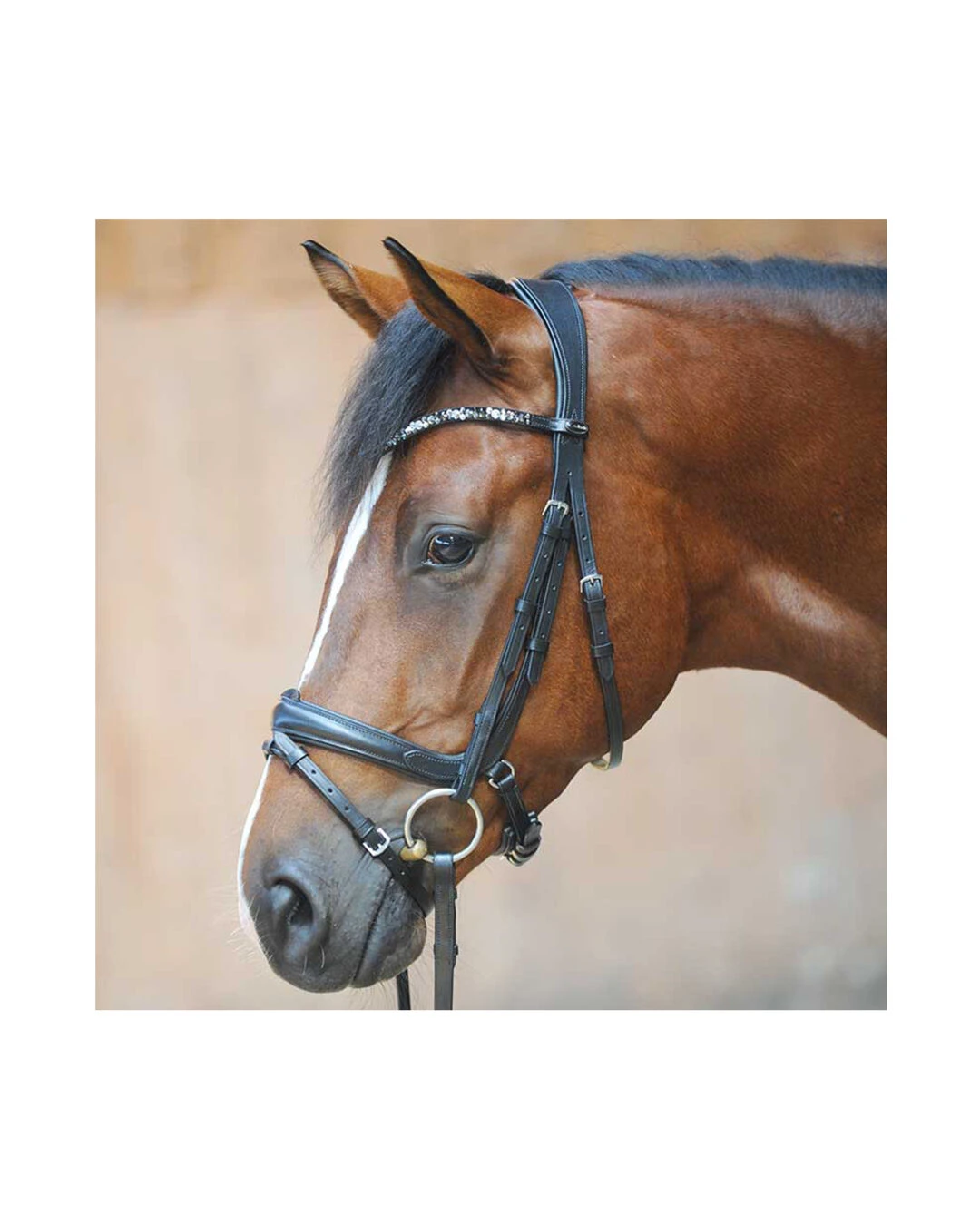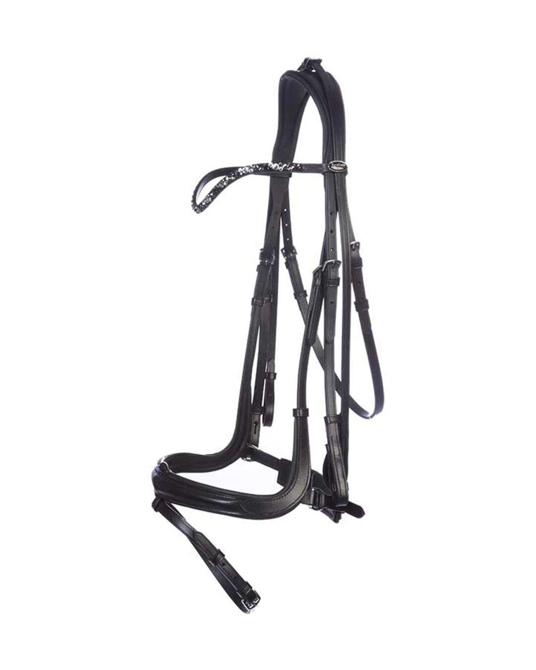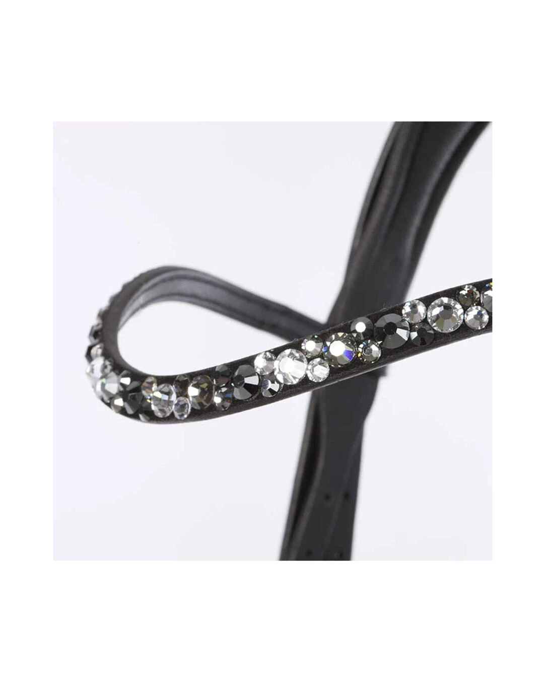 Aus QualitĂ€tsleder mit schwedischem Reithalfter. Reithalfter und ein BackenstĂŒckpaar fest vernĂ€ht (Verschnallungen an den Seiten), das zweite BackenstĂŒck ĂŒberlaufend (Verschnallung im Genick). Seitliche Riemen sind rundgenĂ€ht fĂŒr einen besonders edlen Look. Nasenriemen extra breit und weich unterlegt, zusĂ€tzlich im Gebissbereich groĂzĂŒgig ausgeschnitten. GenickstĂŒck im Ohrenbereich ausgespart und dick gepolstert. Gebogenes Stirnband mit groĂen weiĂen Steinen. Mit schmalen Trensen- und Kombi-KandarenzĂŒgeln aus Leder; TrensenzĂŒgel mit Stegen. Zaumhaken an Gebissverschnallungen.