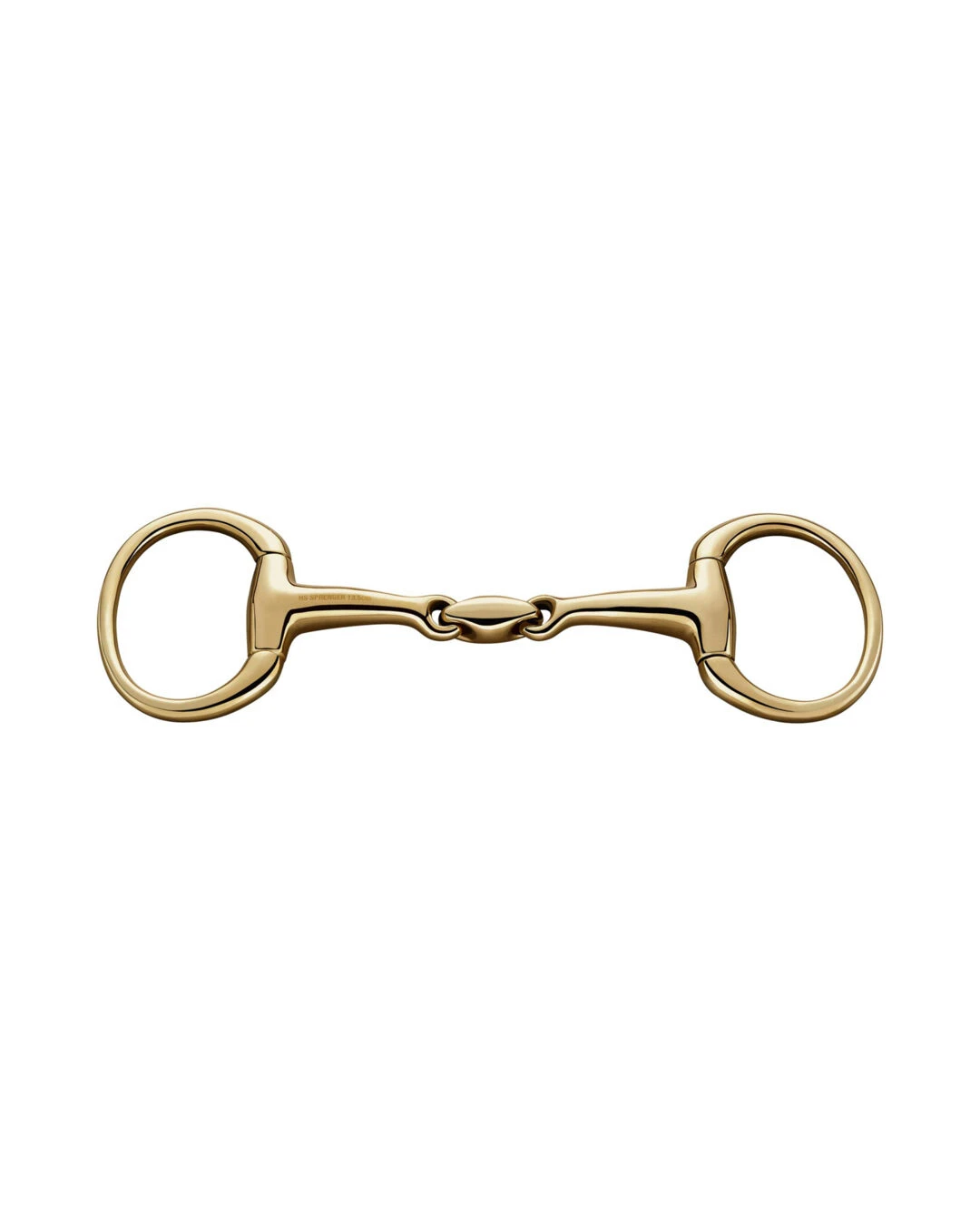 herkömmliche doppelt gebrochene Olivenkopftrense|direkte Ăbertragung der ZĂŒgelhilfe auf Zunge und Unterkiefer durch fixiertes Seitenteil|ruhige Lage im Pferdemaul, maulwinkelschonend|Ringe passen zu goldfarbenen BeschlĂ€gen am Zaumzeug
