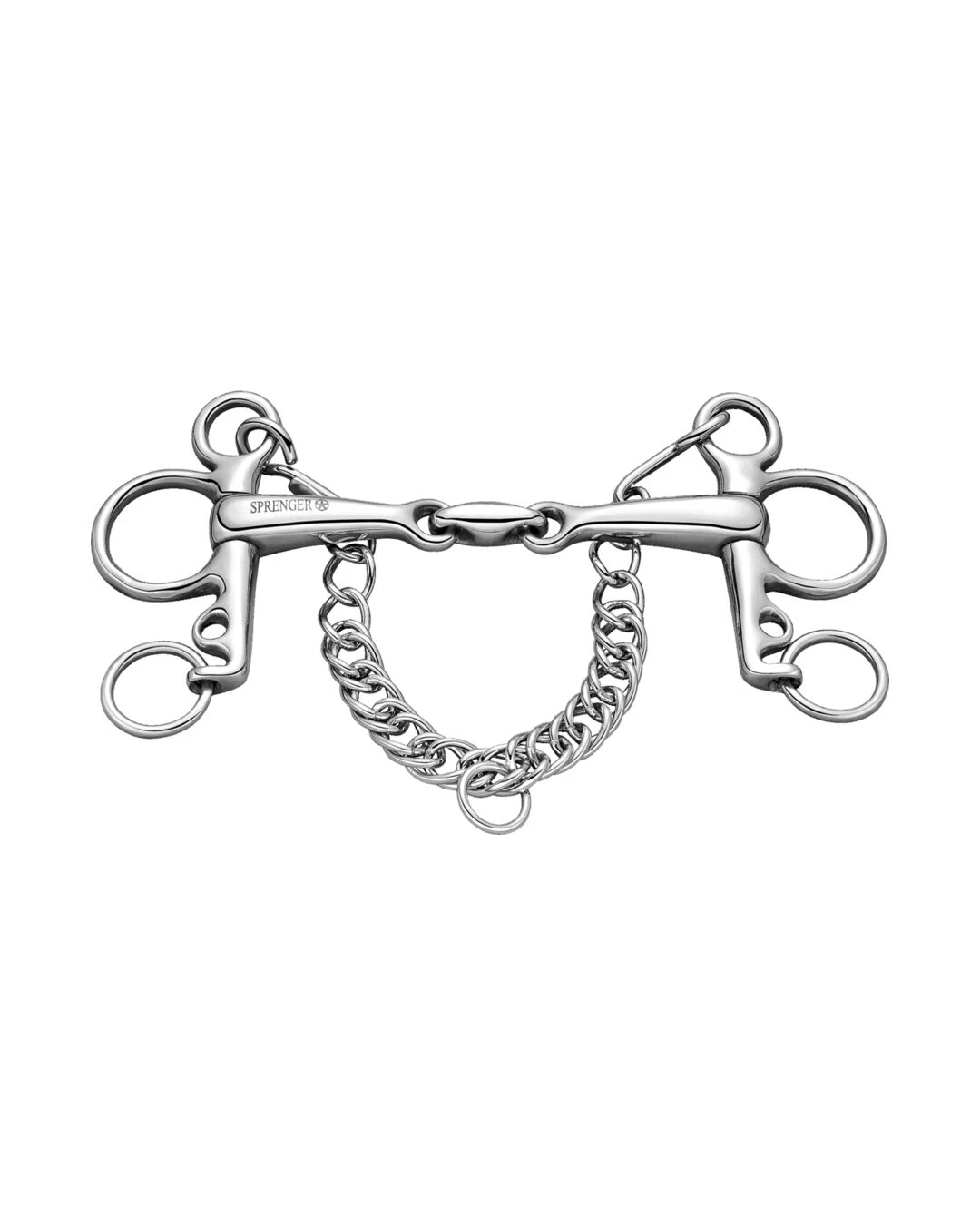 bessere Einwirkung bei starken und stĂŒrmischen Pferden|gezielte und effektive Hilfengebung durch Wirkung auf Zunge, Genick und Unterkiefer|die Kinnkette begrenzt den Druck auf das Genick, sie sollte einen Winkel von bis zu 45° zulassen|die Hebelwirkung auf das Genick kann je nach Verschnallung variiert werden|wird hĂ€ufig mit Pelhamriemchen verwendet, fĂŒr höhere Ausbildungsstufen empfiehlt sich die Nutzung von 2 ZĂŒgelpaaren|Nutzung einer Kinnkettenunterlage zum Schutz des Unterkiefers wird empfohlen