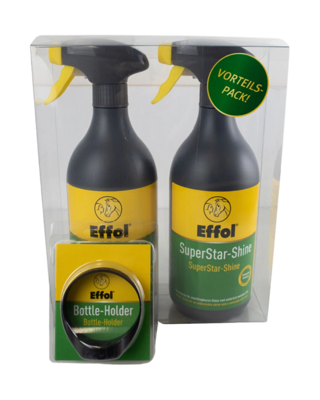Effol Super Star Shine Duo Pack spendet einen bisher nie erreichten strahlenden Glanz, ohne dass sich Fell und Langhaar kĂŒnstlich anfĂŒhlen. Das Putzen wird erleichtert, garantiert ĂŒber mehrere Tage. Das Glanzspray löst Knoten, SpĂ€ne und Stroh beim KĂ€mmen wie von allein Schweif und MĂ€hne bekommen Sprungkraft und Volumen. Sprödes, trockenes Haar wird erfolgreich vermieden. Die Hautfreundlichkeit ist dermatologisch mit sehr gut getestet.