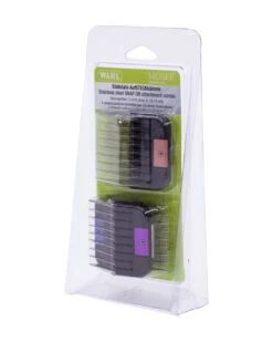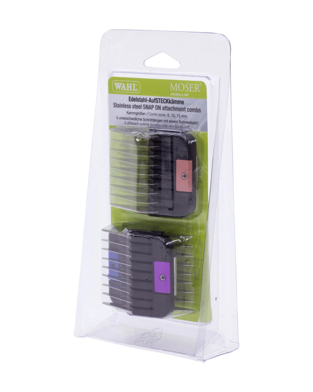 Edelstahl-Aufsteckkamm-Set von WAHL gleiten schnell und effizient durch das Fell – für ein gleichmäßiges Finish! Bessere Haaraufnahme verglichen zu herkömmlichen Aufsteckkämmen für ein zeitsparendes und gleichmäßiges Ergebnis! Sicherer Sitz durch Einrasten am Schneidsatz.