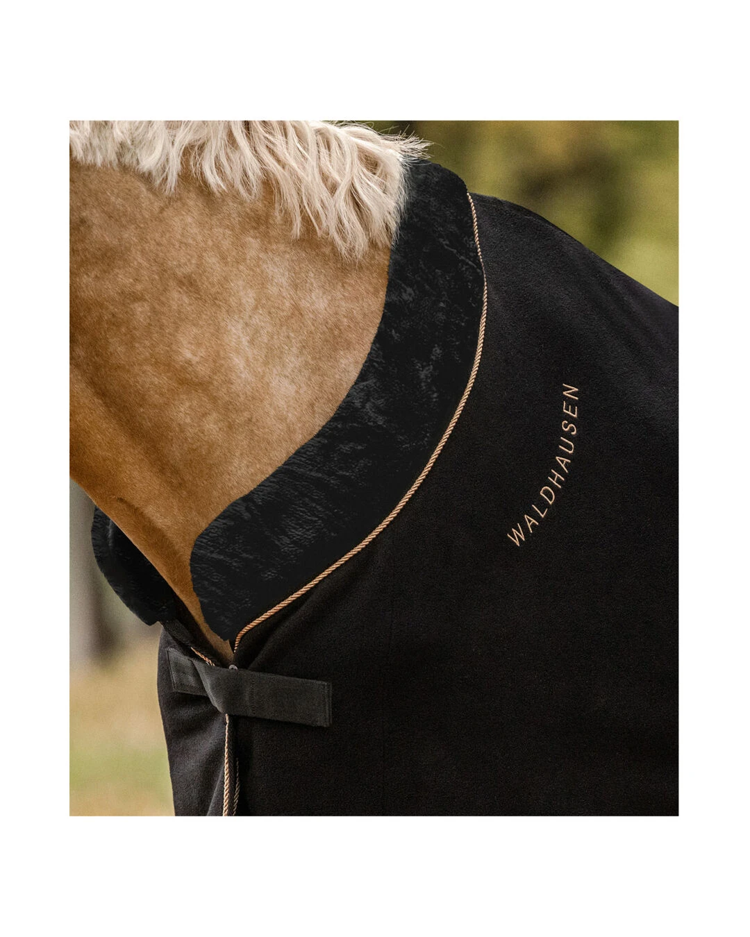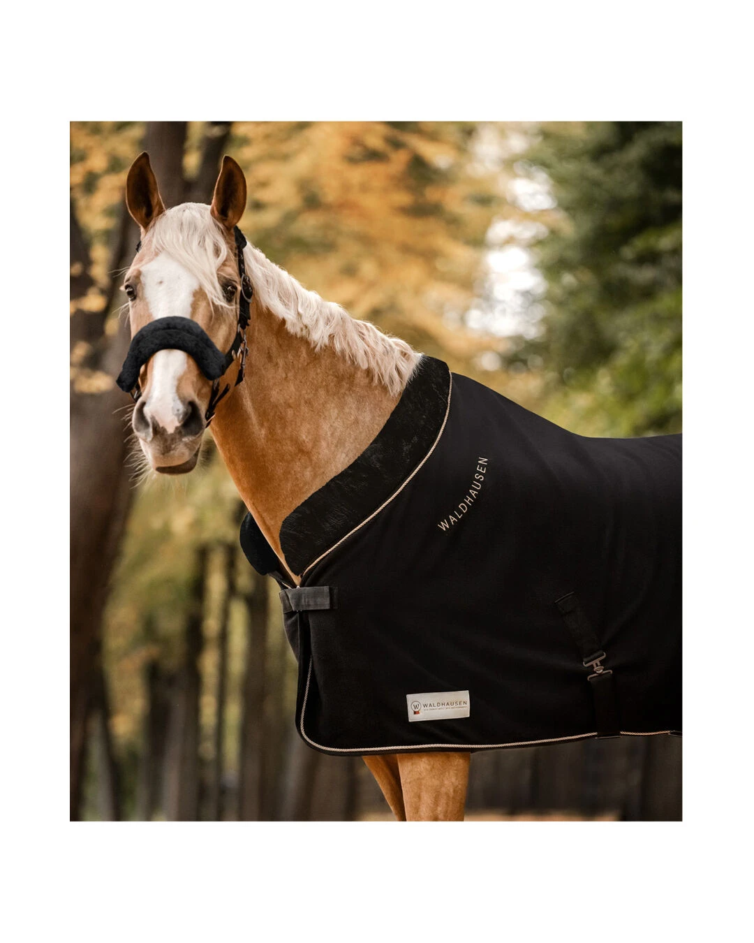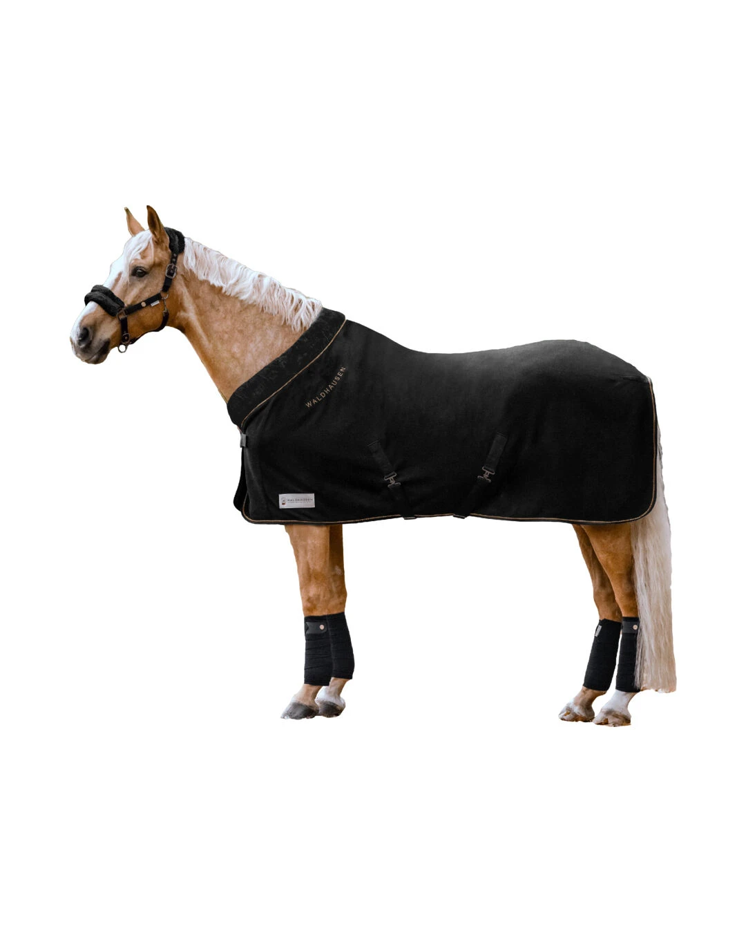 Die Fleecedecke sorgt für eine optimale Abschwitzfunktion. Eine Kordel, eine Stickung entlang des Halsausschnittes sowie hochwertige Verschlüsse sorgen für einen eleganten Auftritt. Die Decke hat eine abnehmbare Kreuzbegurtung.
