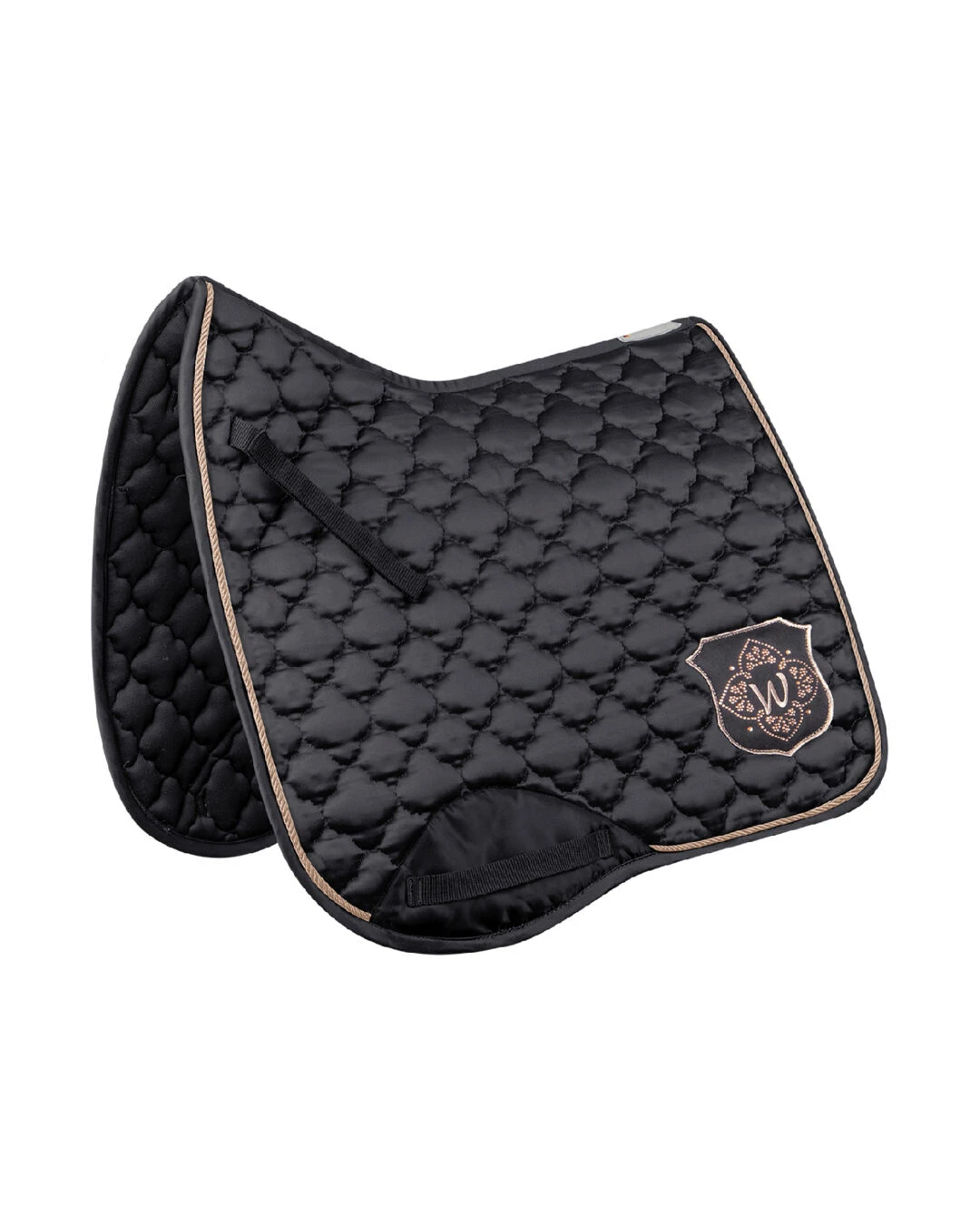 Elegante, hochwertige Schabracke mit floraler Steppung in Seidenoptik. Eine Applikation mit Strasssteinen macht die Schabracke zu einem echten Hingucker. Die funktionelle Unterseite sorgt fĂŒr eine optimale AtmungsaktivitĂ€t. 10 mm Schaum und 200 g/mÂČ Wattierung gewĂ€hrleisten beste Druckverteilung.