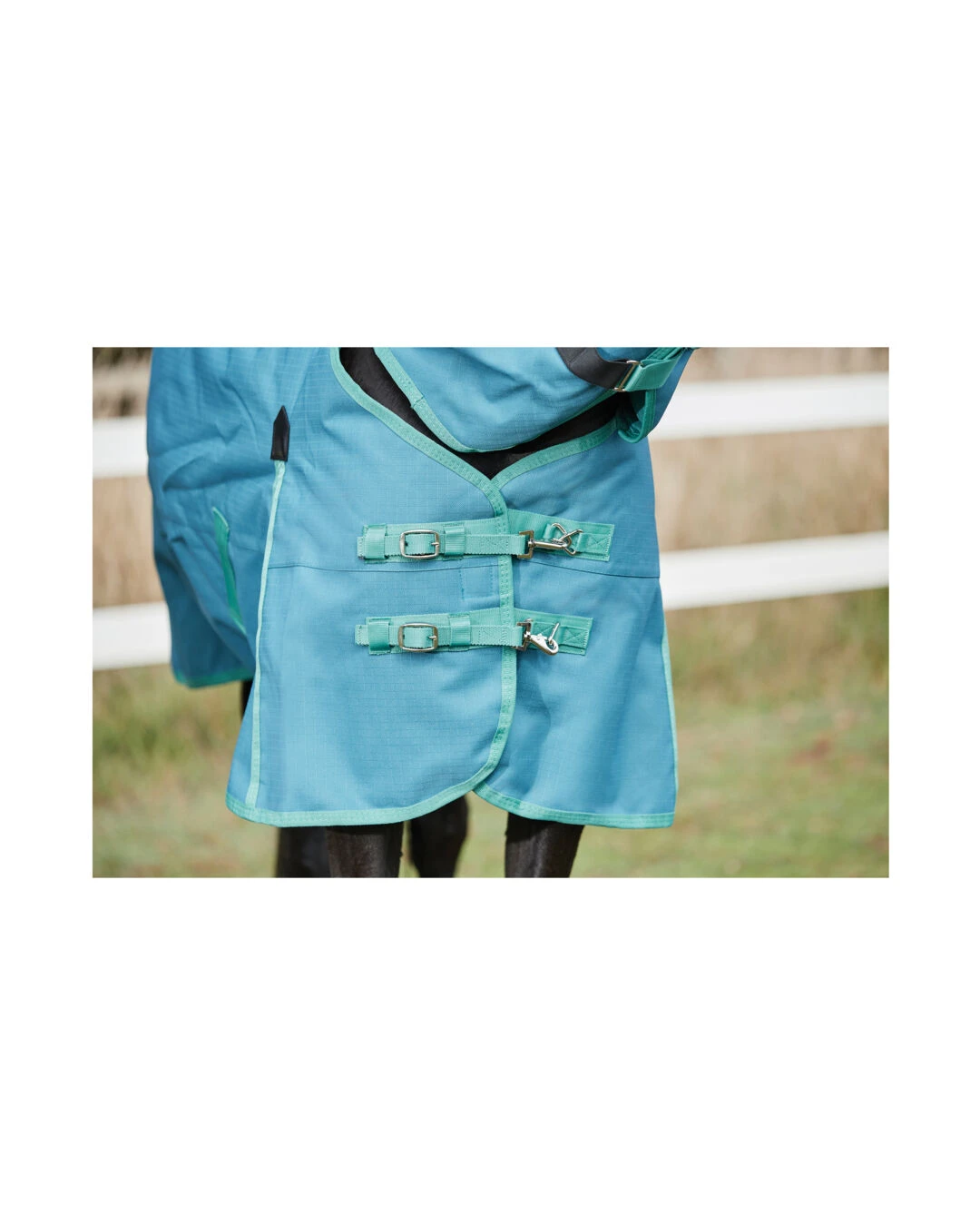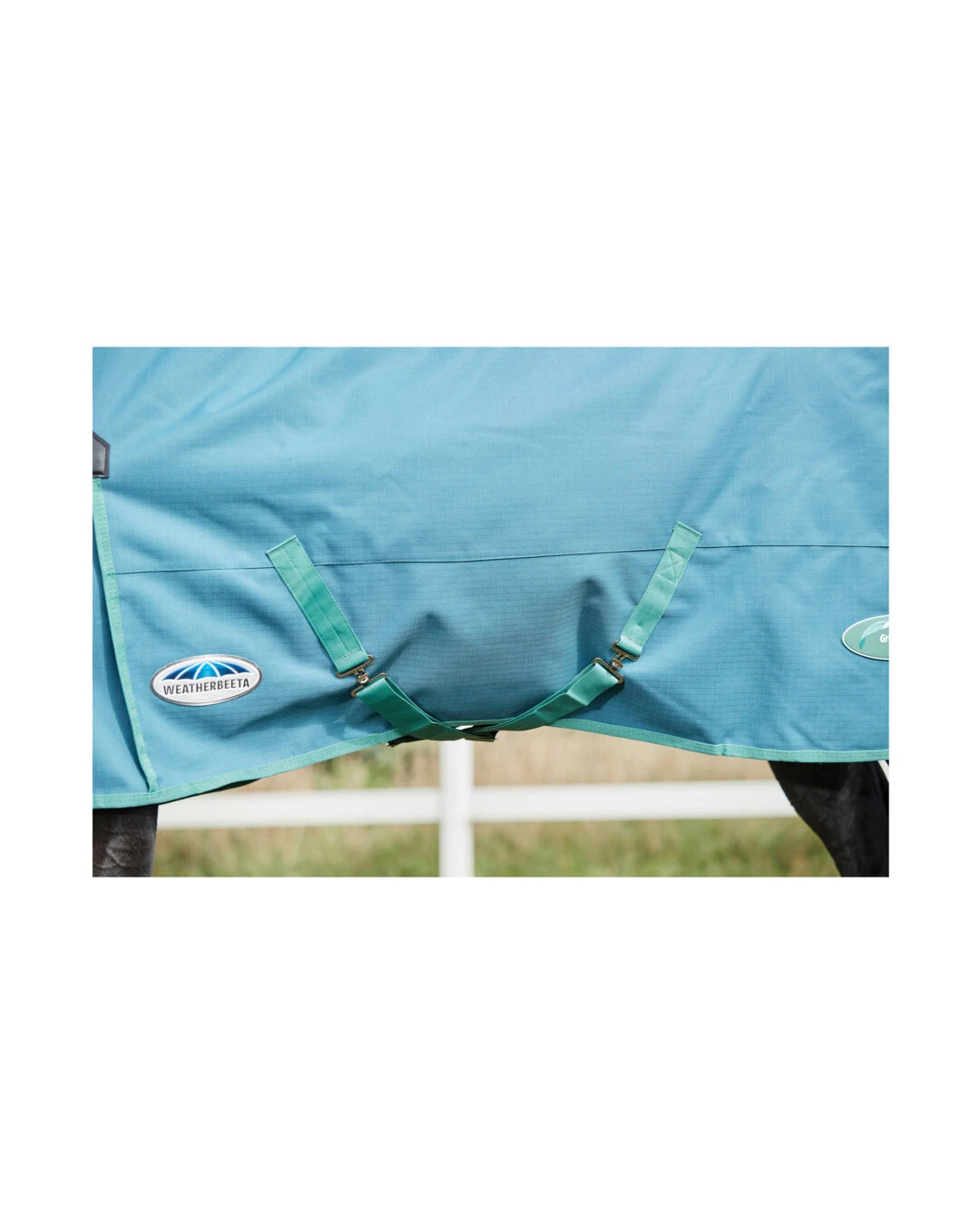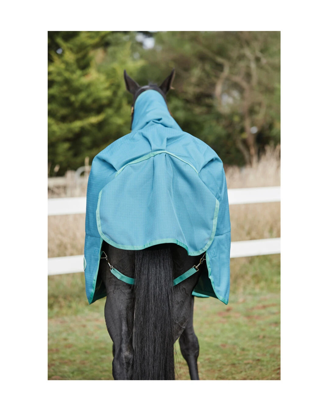 Die WeatherBeeta Regendecke Green-Tec Detach-A-Neck Lite Plus ist mit einem wasserdichten und atmungsaktiven 1200 Denier PCR-Obermaterial aus recycelten Flaschen hergestellt.