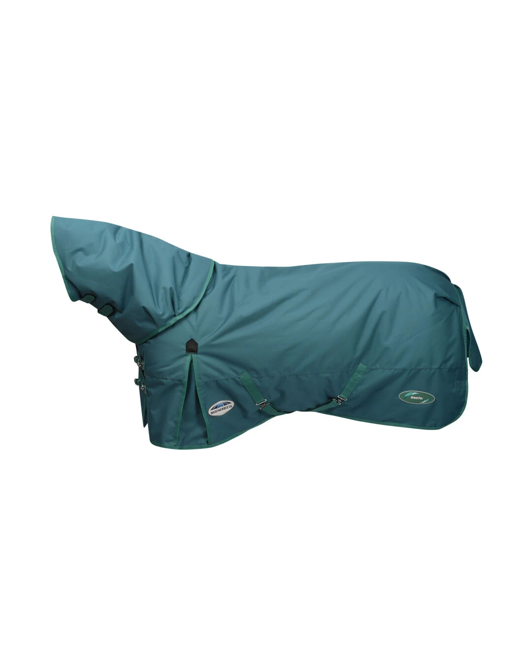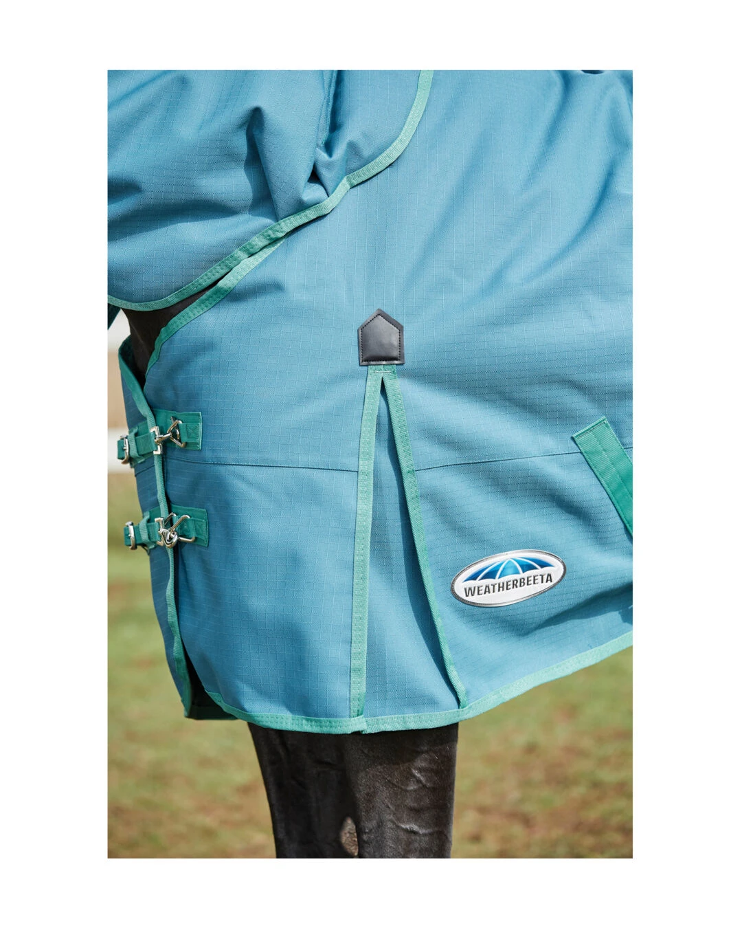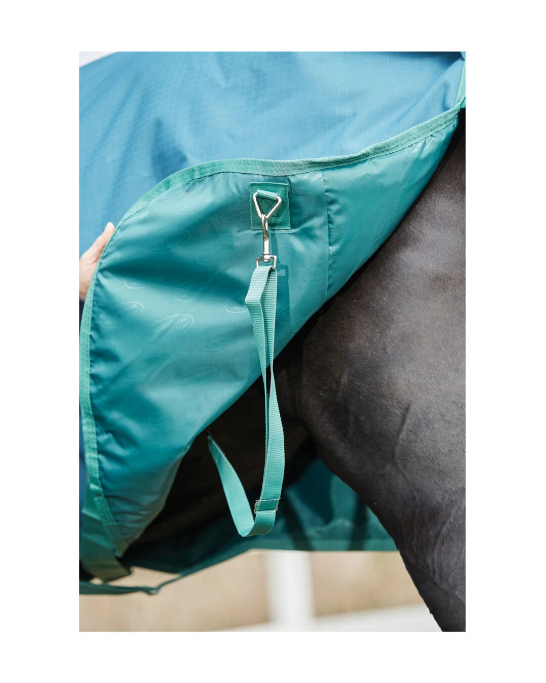 Die WeatherBeeta Regendecke Green-Tec Detach-A-Neck Lite Plus ist mit einem wasserdichten und atmungsaktiven 1200 Denier PCR-Obermaterial aus recycelten Flaschen hergestellt.